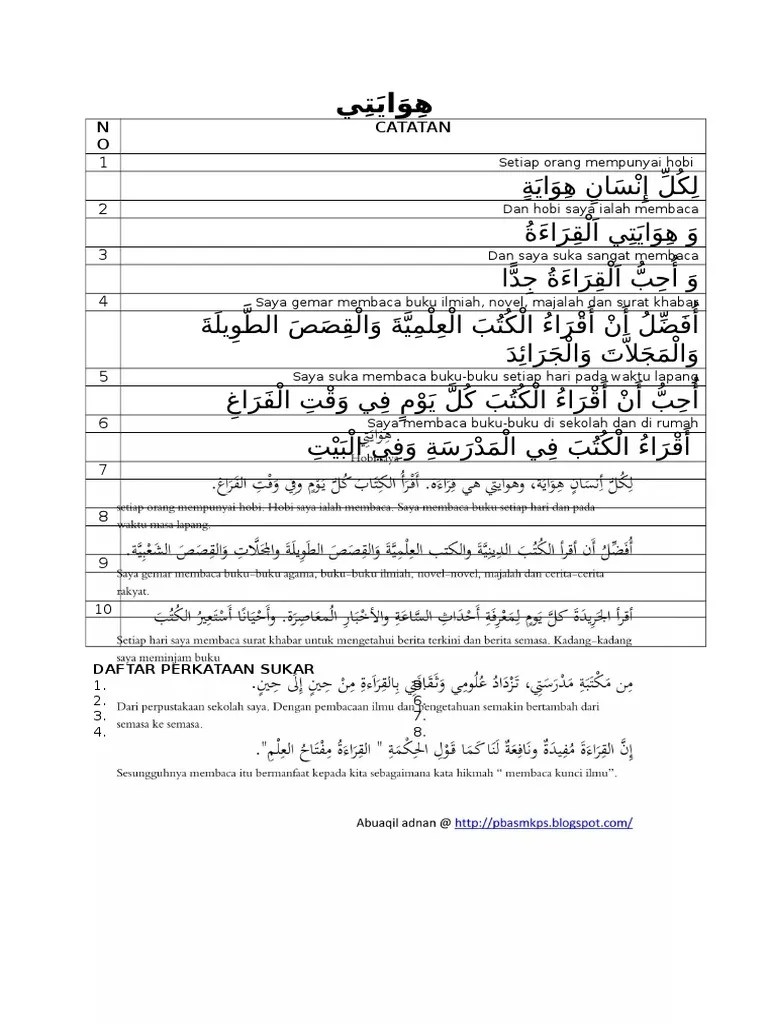 Perkongsian ilmu untuk diamalkan demi menjana iman. Contoh karangan bahasa arab pt3 2020 pentaksiran tingkatan 3, 2 dan tingkatan 1 oleh pelajar, boleh anda semak seperti dikongsikan di sini. Contoh karangan bahasa arab tentang hobi saya (هوايتي) dan artinya.